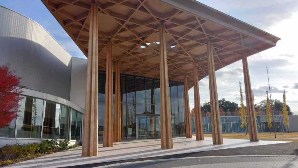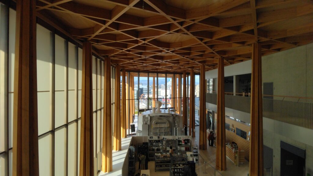 そして、今回さらなる楽しみとして、坂茂氏の設計の豊田市博物館が隣に出来ていて、初めての来訪だったので、わくわくしていた。木をふんだんに使っていて、屋根は格子梁のような構成。期待感を膨らませつつ、内部へ。ホールを抜けて正面玄関側へ移動しつつ、館内を見渡す。すごい建物だなと思いつつも、すごい建物なだけかとも思った。ついさっき、豊田市美術館を見てしまったからかもしれないが、空間構成であったり、細かなディテールだったりを見ると、美術館と比べると見劣りしてしまった。ただ、あなたにこの建物の設計ができますか、と問われれば、何とも言えない。この規模の建物なら関係者の調整だけでも大変だったであろうし、この建物の構造を成り立たせるのにも想像するだけで多大な労力があったことが予測される。また、これだけ木を使うことで配慮・検討すべき項目も膨大だったことは予想が付く。だが、次に豊田市美術館を来訪する時には博物館には足を運ばないだろうなとも思った。だがそれでも、今の日本のトップ建築家は坂茂氏とも思った。ランドスケープも何とも言えない違和感を感じたが、後から調べると、美術館と同じ、ピーター・ウォーカー氏。彼なのに何故?と考えていて、さらに調べると、彼の息子さんがメインで博物館の方はランドスケープデザインを行っているとのこと。世襲制が通じる世界もあるが、実力勝負の世界では世襲はなかなか難しいなと、ぼそっと思った。